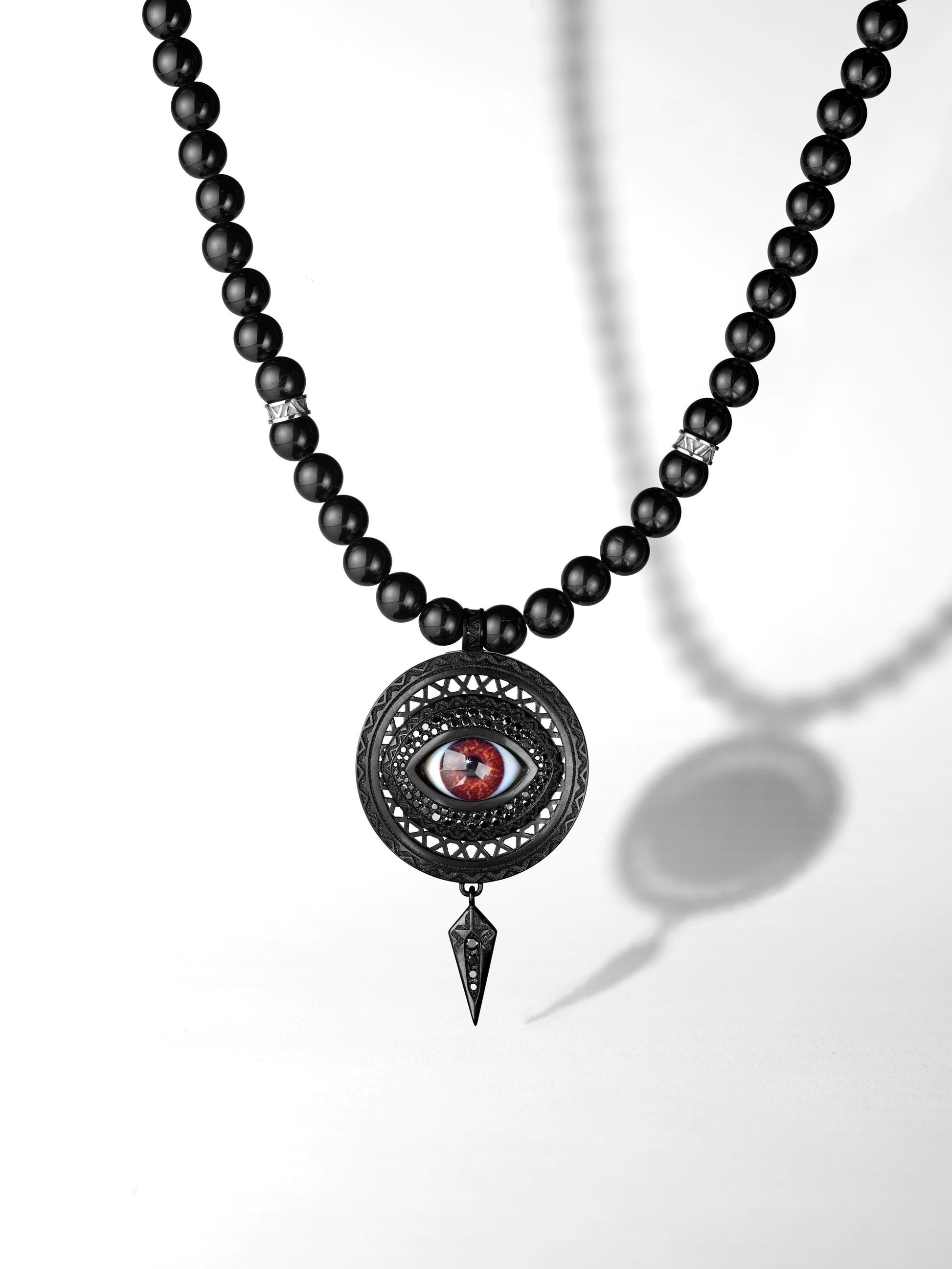 The necklace of brilliant black spinel beads evokes inspiration as it catches the slightest ray of light, draws you in, amplifies the soothing vibe of the darkly sparkling diamonds. The intricate pattern of the medallion in PVD-coated titanium, like the markings on a relic from long ago, only accentuates the mystery of powerful fragility.